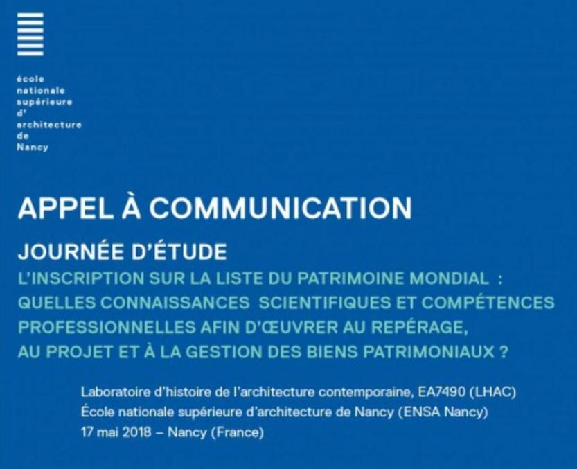 Le Laboratoire d'histoire de l'architecture contemporaine (LHAC) de l'École nationale supérieure d’architecture de Nancy organise en ses murs une journée d'étude le 17 mai 2018: "L'inscription sur la liste du Patrimoine mondial : quelles connaissances scientifiques et compétences professionnelles afin d'oeuvrer au repérage, au projet et à la gestion des biens patrimoniaux ?". À cette fin, elle lance un appel à communication jusqu'au 15 février 2018, autour de trois axes : "la valeur universelle exceptionnelle, une valeur à définir : enjeux et méthode", "le plan de gestion : modèle de gouvernance et d'appropriation" et "les outils de protection règlementaires : articulation, application et mise à jour". Pour participer, rendez-vous sur le site du LHAC.