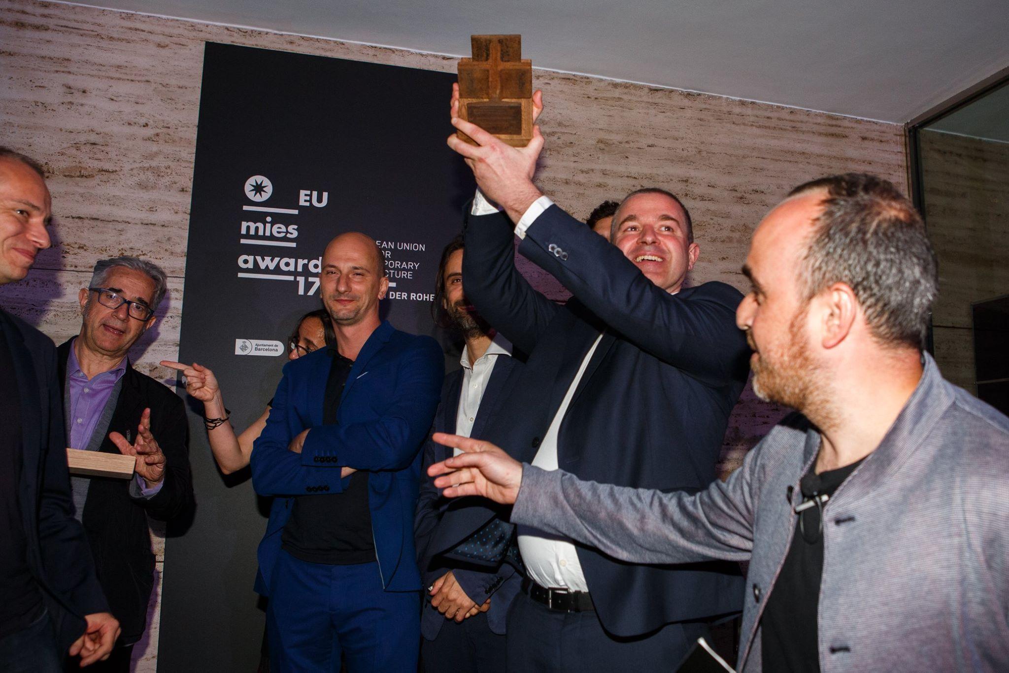 La cérémonie du Prix d’Architecture Contemporaine de l’Union européenne 2017 a consacré, le 26 mai au Pavillon Mies Van Der Rohe à Barcelone, les architectes de MSA et V+ qui ont reçu pour les logements Navez à Schaerbeek la distinction "Emerging Architect", inédit pour un bureau belge. Le président du Jury, Stephen Bates, a particulièrement souligné l'attention que les architectes ont accordée à la conception de ces logements publics, portant une exigence d'espace et de confort rarement égalée, au premier bénéfice de ses occupants. Il a par ailleurs insisté sur la symbolique de cette édition qui récompense pour la première fois depuis la création du prix, deux projets de logement collectif - saluant, avec le lauréat de l'édition 2017 (DeFlat Kleiburg par NL architects + XVW architectuur), la subtile reconversion d'un pan entier du Bijlmermeer à Amsterdam, grand ensemble d'appartements datant des années 1970 promis jusque-là à la démolition. De son côté, Michel Magnier, le Directeur Culture et Créativité à la Commission européenne, a souligné l'importance que revêt la qualité architecturale dans les équipements à finalité sociale, encourageant à implémenter en Europe les bonnes pratiques en la matière. Le Mies Award, a-t-il rappelé, est considéré comme le second prix d'architecture internationale, juste après le Pritzker Architecture Prize.