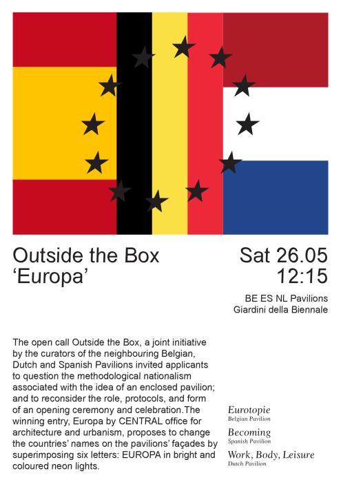 Au Pavillon de la Belgique, les moments forts s’enchaînent en ce week-end d’ouverture : après la rencontre "If the medium is the message, what is the question ?" (jeudi 24 mai à 11h30) avec notamment Cédric Libert (CIVA, Bruxelles), Jurgen Maelfeyt (6'56", Ghent) et Véronique Patteeuw (Bruxelles, co-editor of OASE), les éditions Fourre-Tout (Liège) présentent en avant-première leur dernier livre, Lifting the Curtain, sur les réseaux d’architecture actifs en Europe orientale (jeudi 24 mai à 15h), un ouvrage qui rend compte du propos développé par l'exposition éponyme en 2014 ; en écho à la thématique générale Freespace de cette biennale, la table ronde "Freespace and borders" (animation par l'architecte Carlo Menon, Bruxelles) questionne l’export des architectes belges (vendredi 25 mai à 11h), avec Pierre Hebbelinck (AA Pierre Hebbelinck, Liège), Tristan Boniver (Rotor, Bruxelles) et Paul Mouchet (Central, Bruxelles) ; le vernissage officiel de "Eurotopie" se déroulera le vendredi 25 mai à 15h ; l’appel européen "Starts" dévoilera le projet lauréat (samedi 26 mai à 12h, jusqu'au dimanche 27) et le bureau d’architecture Central (Bruxelles) présentera l’installation "Europa", commune aux Pavillons de la Belgique, des Pays-Bas et de l’Espagne (samedi 26 mai à 12h), suivi de la table ronde "How to invent new public forms ?" (animation par l’architecte Flavien Menu, Office for Cities, Paris-Londres) autour de la nécessité d’élaborer de new commons (samedi 26 mai à 14H30), avec notamment l'architecte et urbaniste Benoit Moritz (MSA, Bruxelles).