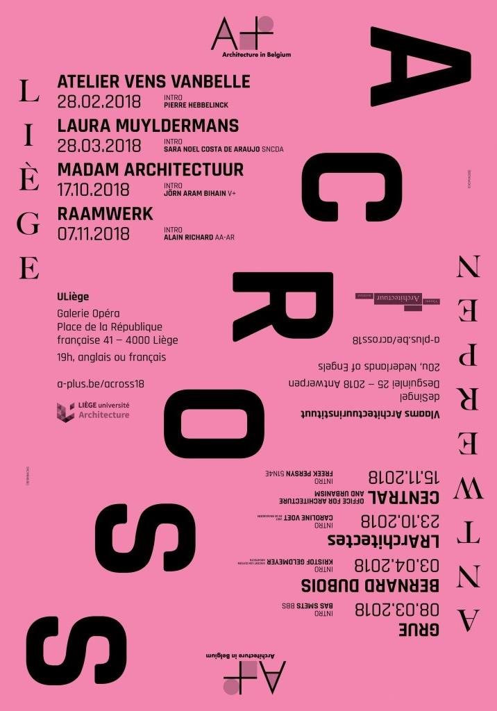 Le cycle de conférences ACROSS, initié en 2015, part du constat d’une méconnaissance et d’un manque de partage et de dialogue entre les cultures francophones et néerlandophones de l’architecture en Belgique. ACROSS souhaite par ailleurs offrir à la jeune scène architecturale, un (premier) podium pour réfléchir et formuler publiquement sa démarche et ses préoccupations. ACROSS permet ainsi d'accueillir de jeunes architectes néerlandophones à Liège (Amphithéâtres Opéra) et francophones à Anvers (deSingel) pour un échange entre les deux cultures architecturales du pays - à chaque fois introduit par un architecte confirmé, contribuant au passage de relais entre générations.