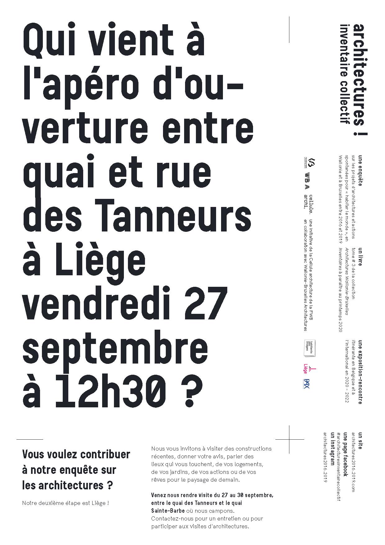 Suite à l'appel lancé pour le prochain Inventaires, 392 projets ont été récoltés dont 150 ont été pré-sélectionnés par les commissaires Gilles Debrun et Pauline de la Boulaye. Afin d’opérer la sélection finale de la quarantaine de projets qui paraîtront dans la publication, les commissaires ont imaginé un dispositif participatif et itinérant dans quatre lieux (Tournai, Pont-à-Celles, Liège et Bruxelles), convoquant public non-averti et experts afin de susciter le débat sur l’architecture.