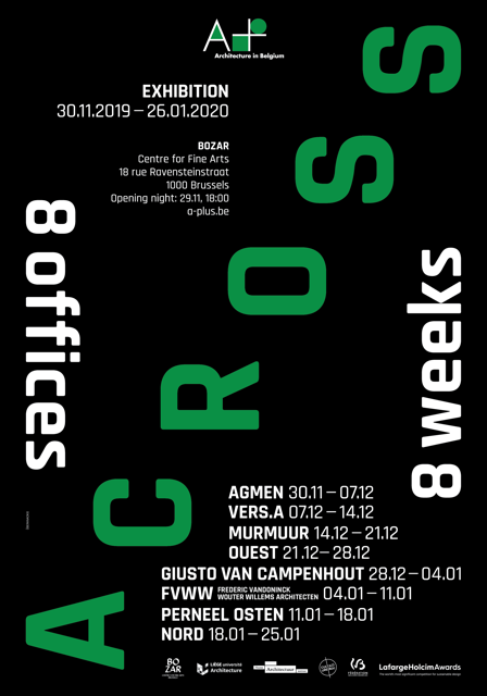 Jusqu'au 26 janvier 2020, l'exposition " Across 8 offices, 8 weeks" réunit à BOZAR les huits jeunes bureaux qui s'étaient présentés en conférence en 2019 à Liège ou à Anvers : Agmen, Vers.A, Murmuur, Ouest, Giusto Van Campenhout, FVWW, Perneel Osten et Nord.
