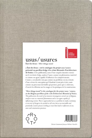 « État des lieux » est le catalogue du projet usus /usures présenté au pavillon belge à la 12e Biennale d’architecture de Venise. Cette publication, issue d’une enquête intensive menée sur le territoire belge, analyse l’usure comme un phénomène matériel et comme un agent capable d’influencer les comportements. L’usure y est abordée non pas comme un problème en soi, témoin d’une erreur de conception qu’il faudrait à tout prix éviter, mais comme un processus inévitable qui permet, pour qui s’y intéresse, d’ouvrir la réflexion sur les usages et les pratiques de la construction.
