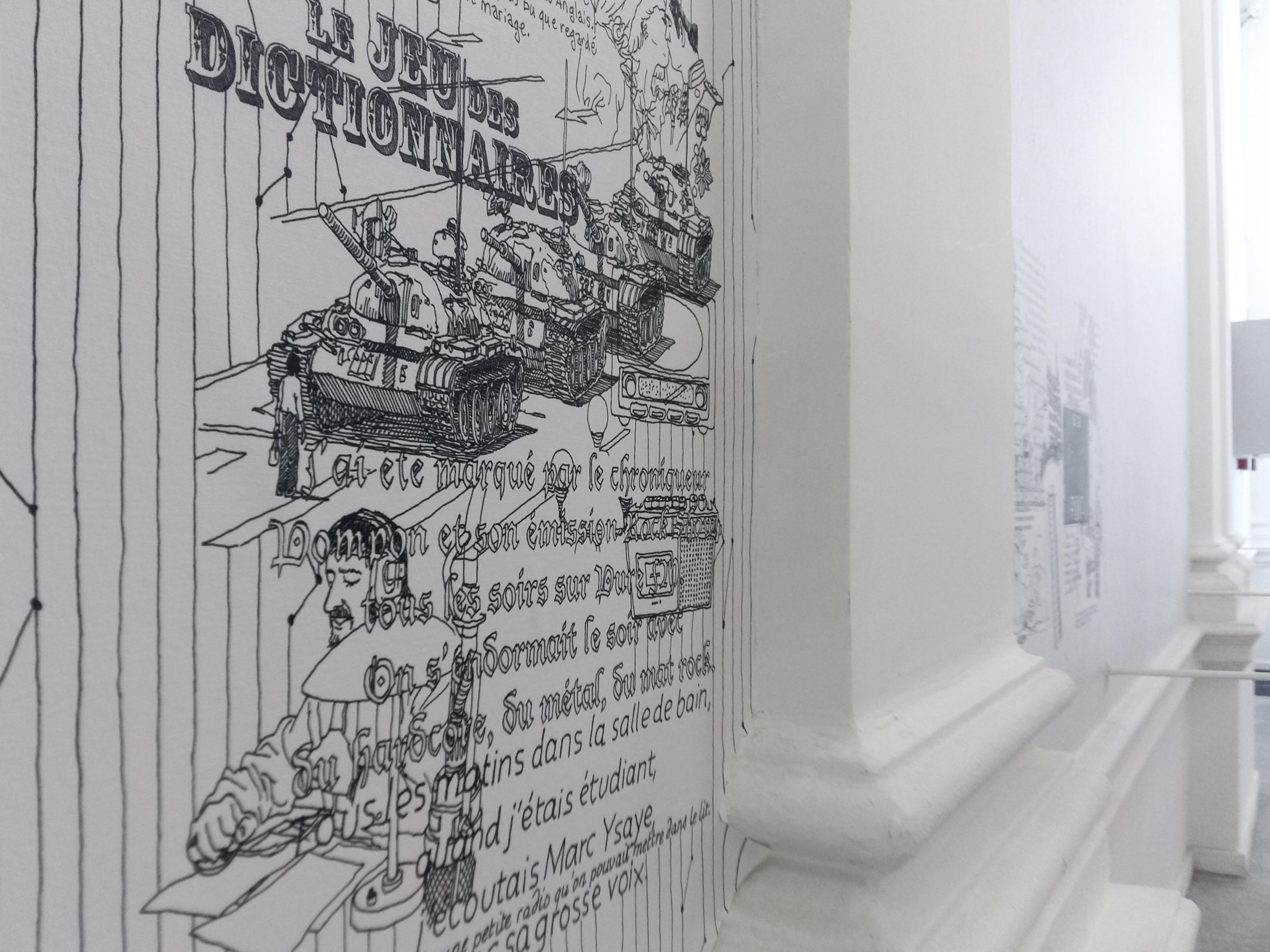 Implantés dans un ancien hôtel de maître, les bureaux du Conseil supérieur de l’Audiovisuel (CSA), chargé de la régulation de l'audiovisuel en Communauté française, sont aménagés par le bureau Ledroit Pierret Polet Architectes qui, dès le stade du dépôt de son offre, a proposé de travailler avec Eric Valette. Avec cette intervention artistique qui prend place sur neuf pans de mur du bâtiment, l’artiste français nous offre une plongée dans nos souvenirs de spectateurs et d’auditeurs en exhumant les petits et grands moments de notre histoire collective. Après avoir recueilli les témoignages du personnel du CSA sur leurs moments forts du petit écran et de la radio, l’artiste français les met en dessins à partir d’images d’archives et d’extraits de phrases des employés, sous la forme de concentrations graphiques plus ou moins dense (atteignant à certains endroits la saturation), qui s’insèrent et se lient à la trame linéaire du papier peint apposé dans les bureaux et les espaces de circulation. Entre les lés du papier peint, Sandra Kim côtoie Dominique Strauss-Kahn et le génocide cambodgien, tandis que Lady Diana et le prince Charles se mêlent au Jeu des dictionnaires et aux tanks de la place Tiananmen bercés par la voix de Marc Ysaye.