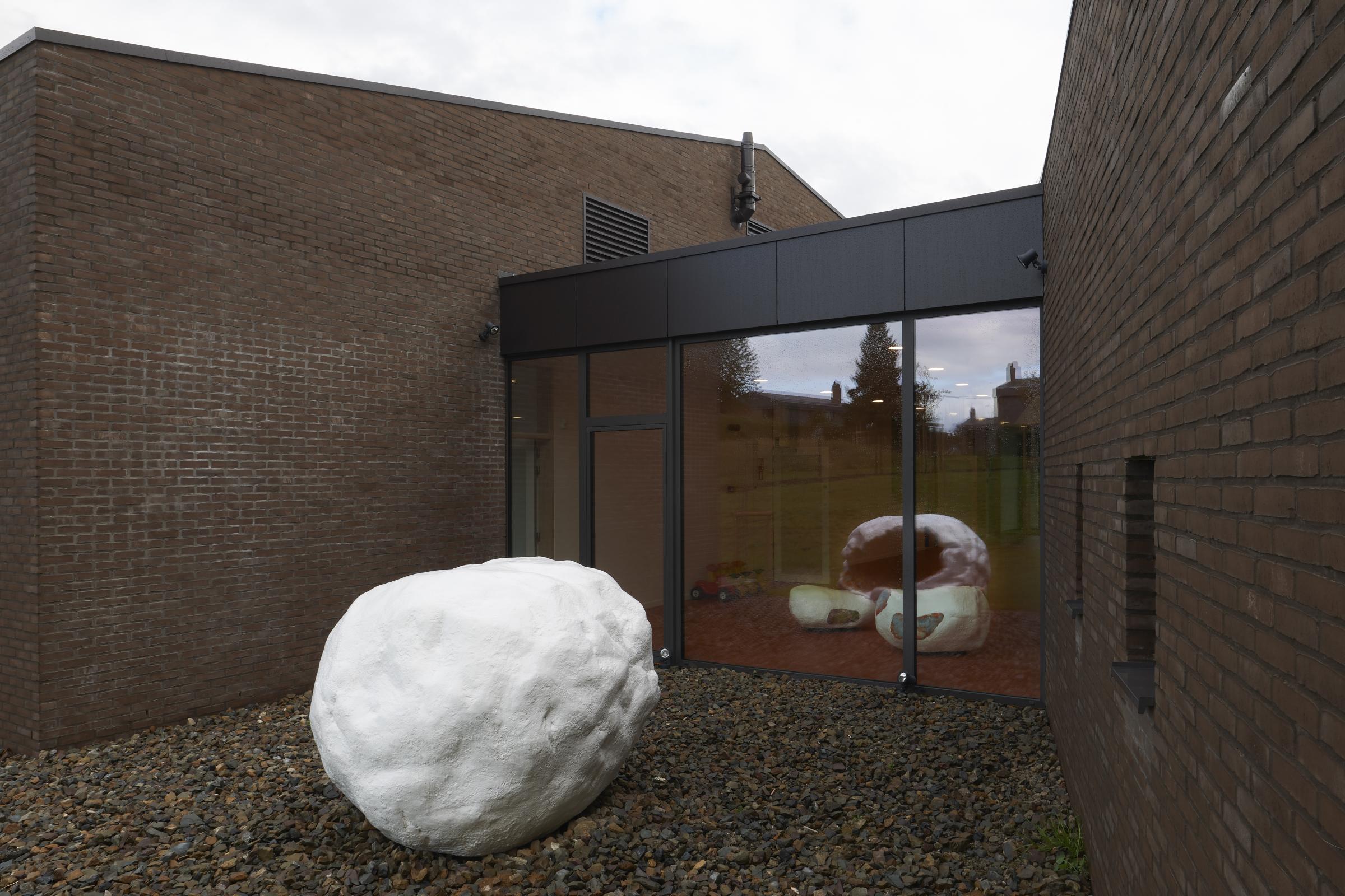 Souhaitant contribuer au dispositif pédagogique d’éveil des enfants ainsi qu’à la qualité de vie qu’offre le lieu aux utilisateurs, l’artiste Sophie Langohr enrichit la perception spatiale, en y introduisant des éléments emprunts de poésie. Deux sculptures, tout en rondeur, tranchent avec l’architecture de Daniel Delgoffe. Dans le patio, trône une géode, cavité rocheuse tapissée de cristaux et d’autres matières minérales colorées. « Un monde intérieur (…), un monde scintillant dont la beauté naturelle et la féerie ont toujours excité l’imaginaire, un monde magique, puissant catalyseur de curiosité » (S. Langohr). La deuxième, plus modeste en taille et accessible aux enfants, prend place dans l’espace d’accueil.