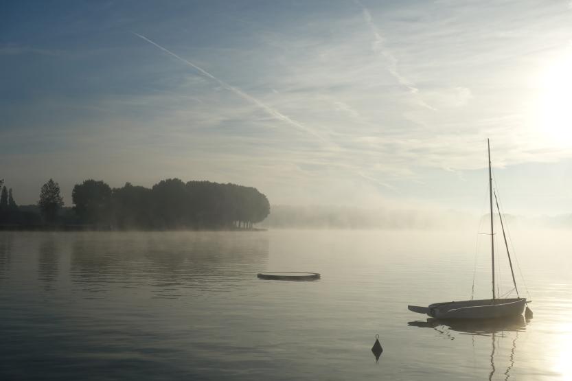 Point à la ligne. Une île artificielle dans le bassin du Grand Large vient ponctuer la ligne dessinée par le bureau d‘architecture AgwA pour l’extension du Centre Adeps. Recouverte d’une fine couche d’eau, elle reflète le ciel comme un vaste miroir. L’île disparaît et réapparaît en fonction du niveau de l’eau du bassin, que le passage des péniches dans les écluses fait varier. Ce rythme lent mais incessant rappelle le passé industriel du Grand Large, site de nombreux chantiers navals au début du XXème siècle. Le point à la ligne s’appuie sur le site et son histoire pour marquer le début d’un nouveau paragraphe; celui de l’exploitation du site par la société des loisirs du XXIème siècle. Extrait du dossier de présentation rédigé par Adrien Tirtiaux