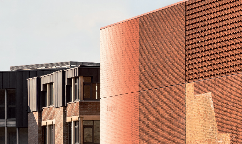 Pour le théâtre Jean Vilar, Ouest architecture a proposé de travailler avec les frères Pieter et Robin Vermeersch. Le premier intervient à l’extérieur du bâtiment en peignant sur la façade sud du bâtiment un dégradé de couleur inspiré par la couleur de la brique (rouge – marron – rose). L’usage de la peinture oscille entre abstraction et représentation. « D’une part ce dégradé de couleur dépeint analytiquement la couleur en tant que donnée abstraite et mystérieuse. D’autre part, cette altération analytique offre une illusion d’espace et donc un premier pas vers la représentation » (extrait de note d’intention). Robin Vermersch, en collaboration avec Eva Moulaert, intervient à l’intérieur du bâtiment en utilisant le médium de la céramique. Ensemble, par un jeu réalisé à partir de carrelages fabriqués artisanalement, ils inventent un nouveau vocabulaire où typographie et formes abstraites s’entremêlent. La signalétique devient ainsi un élément artistique et spatial.