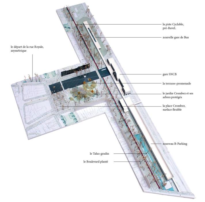 Face aux multiples contraintes et usages de cette entrée de ville (gares SNCB et TEC), le projet retenu redéfinit avec pertinence l'équilibre entre les mobilités (piétons, cylistes, automobilistes...), tout en offrant un panel de solutions spatiales particulièrement lisibles (auvent paysager, parvis,...). Sa concrétisation s'accompagnera d'un processus de participation, intégré à la mission des maîtres d'oeuvre. Enfin, précisons que ce marché d'architecture a fait l'objet d'une commande d'article à Pierre Vanderstraeten, membre du jury, à découvrir sur la page dédiée de notre site.
